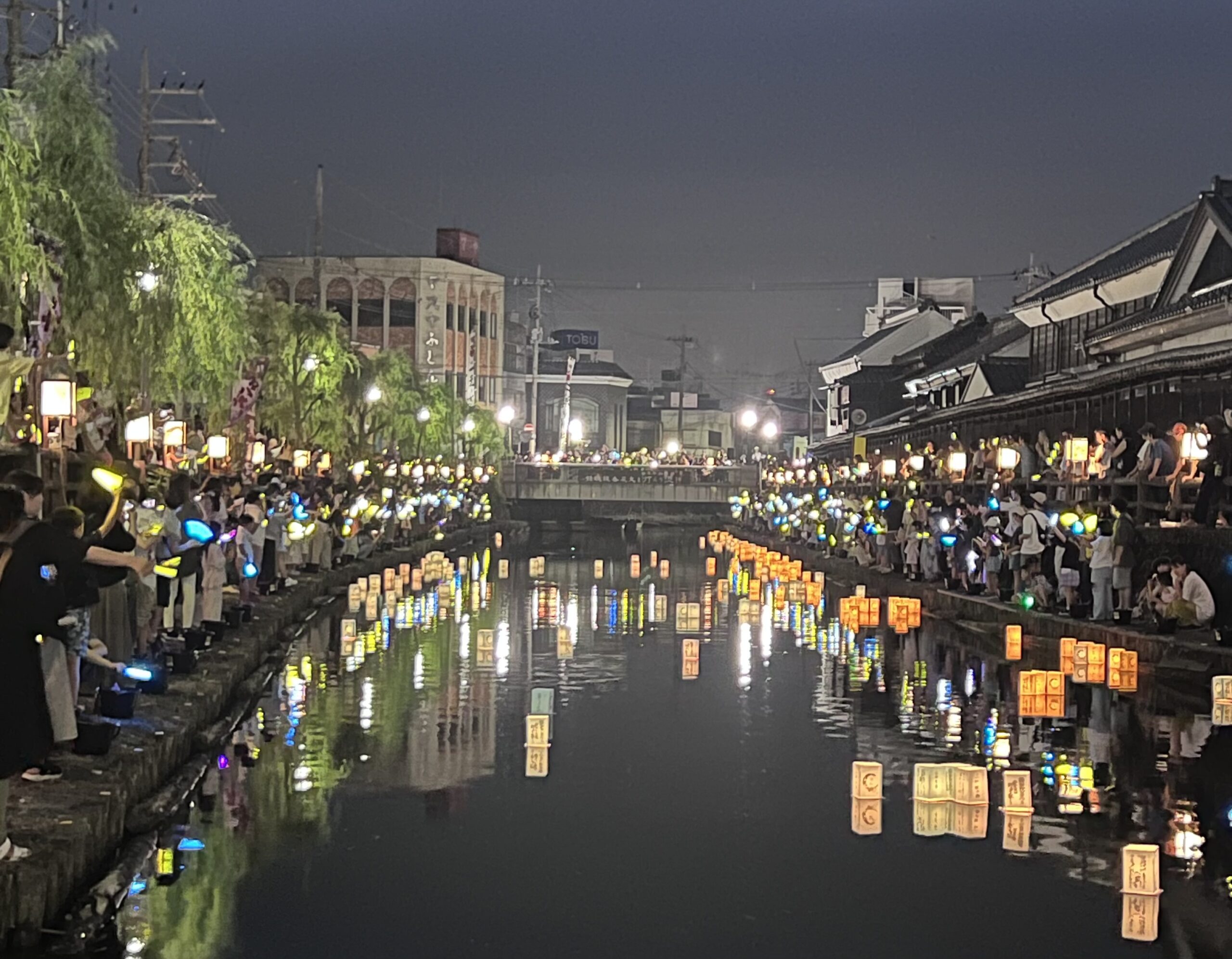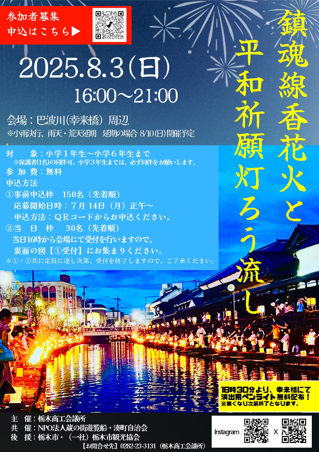 子どもたちが手にする線香花火のやさしい光、一人ひとりの願いが込められた灯ろうが巴波川を静かに流れる光景、ペンライトや音楽がつくり出す幻想的な空間を演出しております。参加者も観覧者も心癒される、祈りと希望を感じる夏の夜を、ぜひご体験ください。